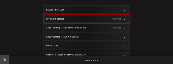 3. Tap Setting > Maintenance > Firmware Update on the touchscreen. Choose the folder with the firmware update file, and tap the latest version of the .firm file. Tap OK to confirm the update.