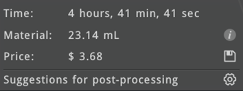 6. After the slicing is complete, a Slicing Result panel will be output by default in the upper-left hand corner of the ideaMaker interface. It shows the print time, material, price and suggestions for post-processing, etc.