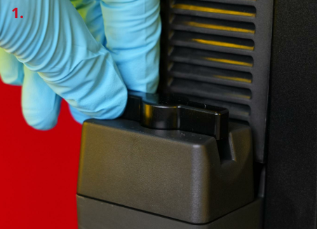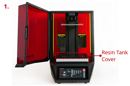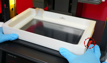 d) As shown in the red circle in the figure 1, press the release button, and the resin tank will automatically pop up.