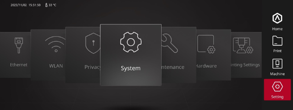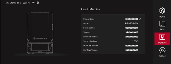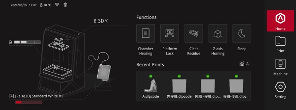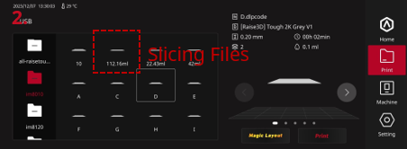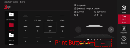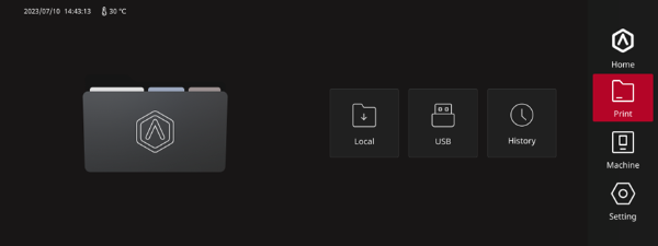 After the printer is powered on and the liquid resin is filled, insert the USB disk containing the sliced file into the USB interface. Choose USB from the Print interface. If the sliced file has been transmitted to the connected DF2+, choose Local from the Print interface.
