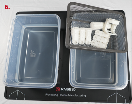 After the careful washing is complete, put the washing basket on the washing box to drain the cleaning solvent until there are no obvious droplets. Washing the models manually is complete.