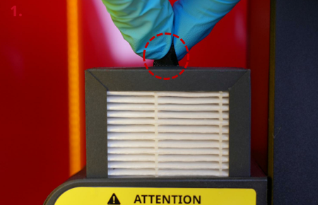 d) As shown in the red circle in the figure 1, locate the handle of the filter element, lift it up and replace it.