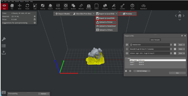 7. In the instant operation bar, click Preview to preview the sliced file. Click Export to Local Disk to save the .dlpcode file and export it onto your local or USB disk. Click Upload to Printer to send the .dlpcode file to the connected printer.