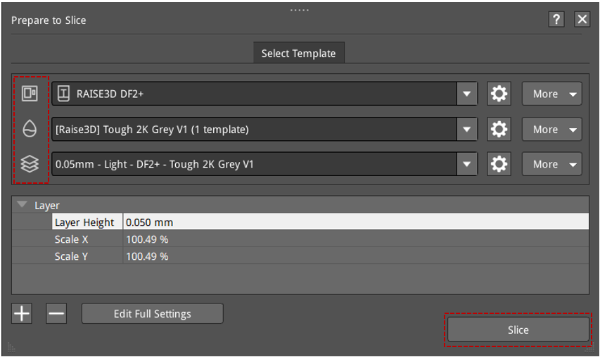 to open the Prepare to Slice panel, and then select the DF2+ printer, material and template. If there is no need to process or support the model, click Slice to perform slicing straight away.