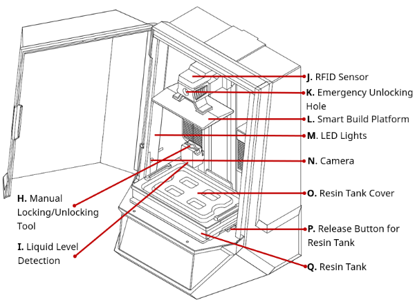d) As shown in the figure 3, open the chamber door and remove the smart build platform.