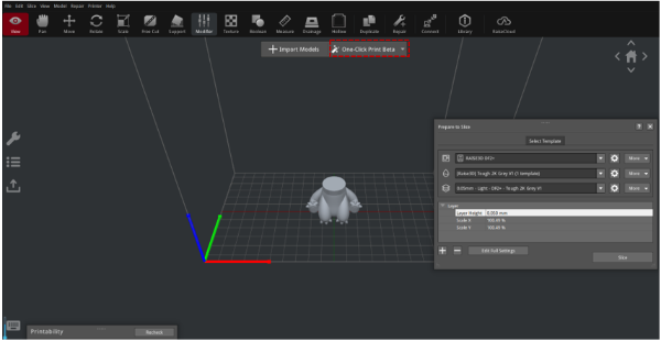 4. You can also click the One-Click Print Beta button, and the ideaMaker will automatically orient, create supports, and arrange all your models for efficient slicing. Once the process is complete, you can make any necessary adjustments you wish and then export or upload the print file to your printer.