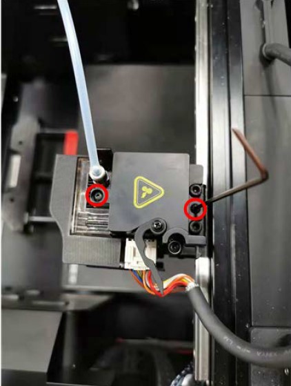 3.Use a 2 mm hex wrench, loosen and remove the two screws securing the extruder connection board cover to the print head.