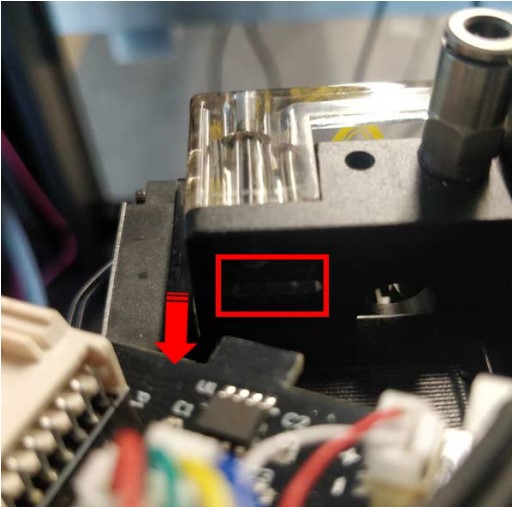 5.Gently pull out the extruder connection board in the direction of the arrow shown below. Be mindful of the small tab holding it in place.