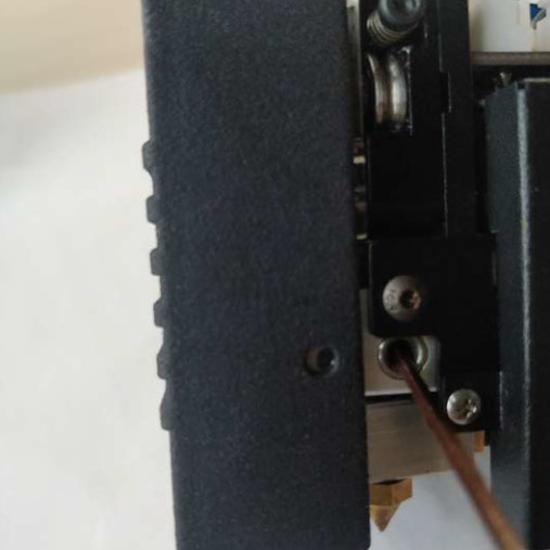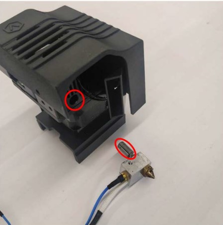 7.Use a 2 mm hex wrench to loosen the hot end set screw. At this step, the entire hot end assembly can be removed along with the heater rod and temperature sensor.