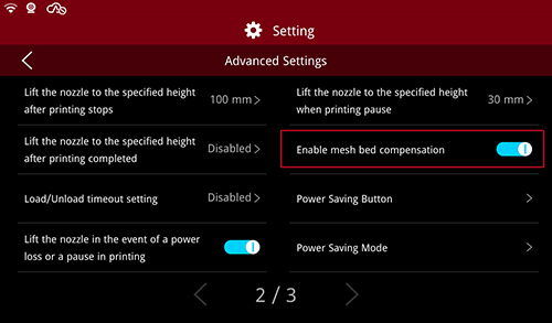 5.Select the button beside the “Enable mesh bed compensation” to turn on/off the function (Gray means “Off” and blue means “On”).