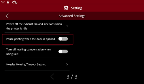 5.Select the button beside the “Pause printing when the door is opened” to turn on/off the function (Gray means “Off” and blue means “On”).