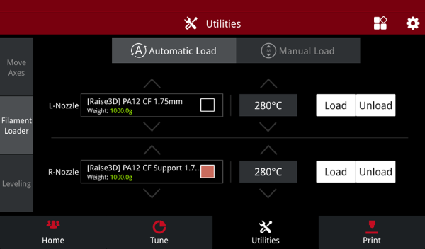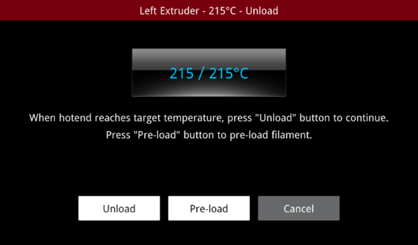 1.Go to the “Utilities” page, select “Filament Loader”, and select “Unload”. Wait for the temperature to reach the set temperature, then select “Unload”.