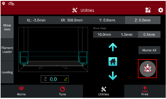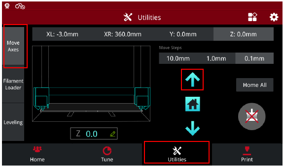 3.On the “Utilities” tab, select ”Move Axes”. Press the blue up arrow to raise the X-axis gantry to a suitable height for the following operation. (Refer to the picture below as a reference for a suitable height.)
