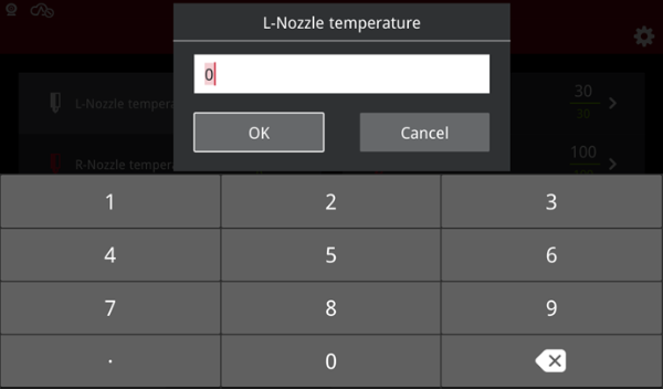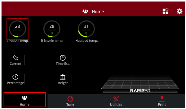 8. At the touchscreen, select the “Home” tab-> ”L-Nozzle temp” and set the nozzle temperature to 200℃.