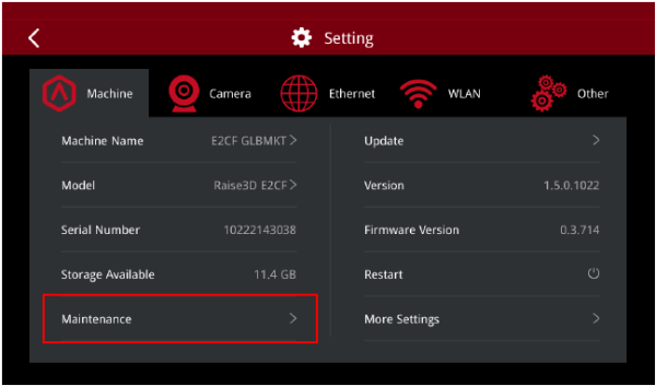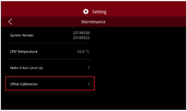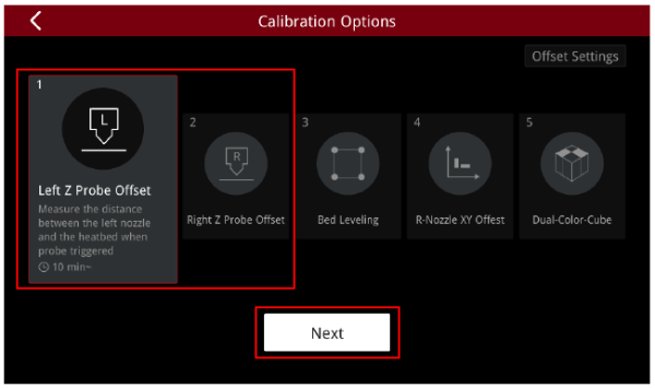 15.Any time a hot end is adjusted, it is important to run the “Left Z Probe Offset” and “Right Z Probe Offset” for successful printing. On the touchscreen, press the gearwheel icon in the upper right corner of the screen, then Maintenance -> Left Z Probe Offset/ Right Z Probe Offset ->