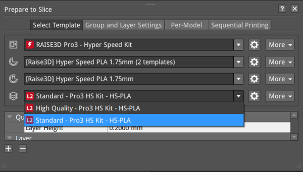 With Hyper Speed Mode on, choosing the default Premium filament for the extruder will activate the L1 Template, while choosing default Hyper Speed filament for extruder will activate the L2 Template.