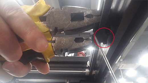 4. Ask someone to grab both ends of the belt with two pliers. Insert their ends into the block as shown in the figure below. Make sure that the teeth on the belt match the teeth on the block.