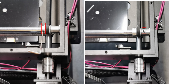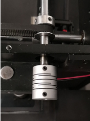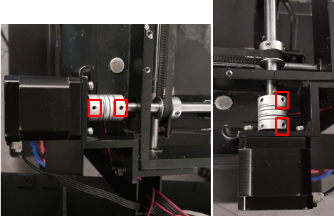 7. Find the Y motor which is on the rear-right side of the printer and you will see there is a shaft coupler. Then unscrew the two grub screws and another two round head screws. (the couplers on your machine may have 4 grub screws and no round head screws)