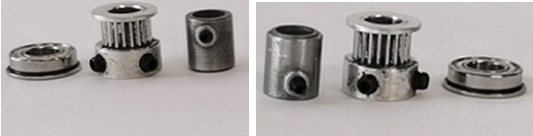 15. Collect the belt pulleys and spacer collets on the right side and put them back to the new shaft before it reaches the sliding block. Wrap the rear belt onto the belt pulley.