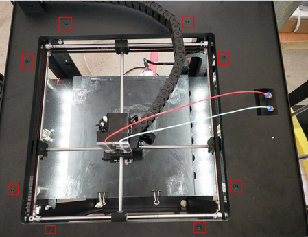25. Pre- tighten the two screws which hold the support frame until you can’t move the Y motor easily. (When pre-tightening the screws, the motor should be held by hand to prevent the coupling from breaking)