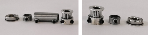 10. Push the new shaft into the original position. Put the belt pulleys ,spacer collets and bearing back on the new shaft before it reaches the sliding block. Wrap the left belt onto the belt pulley.