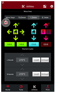 Once both homing procedures are completed, disable the motors by pressing the round icon in the top left of the screen.