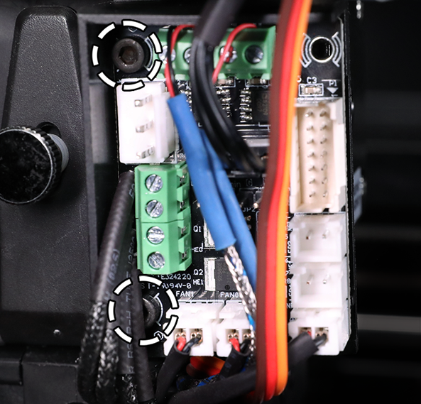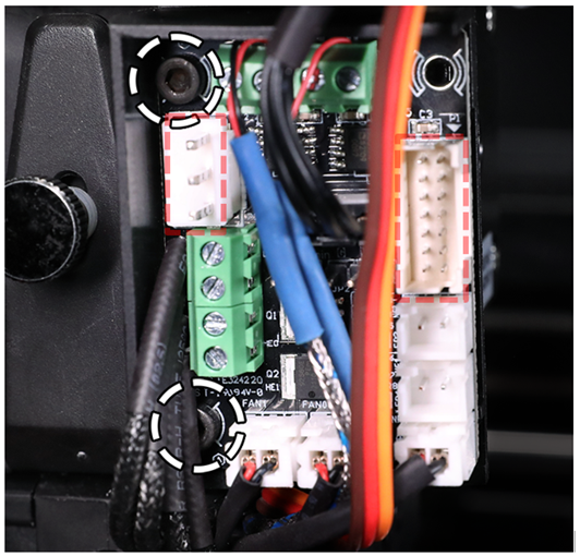 8. Use the 2.5mm hex wrench to remove the two screws, marked in the image below, to more clearly access the heater rod cable and cable terminal. The heating rod cable cannot be removed unless the Extruder Connection Board is removed from the printhead. It can be helpful to temporarily disconnect the 3-pin cable and the colorful ribbon cable for easier access to the board.