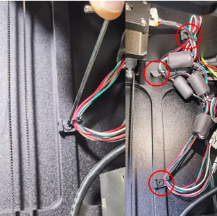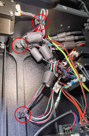 14. Reconnect the three cables to the clamps using cable ties. Screw the three clamps back into place as shown in the red circles.