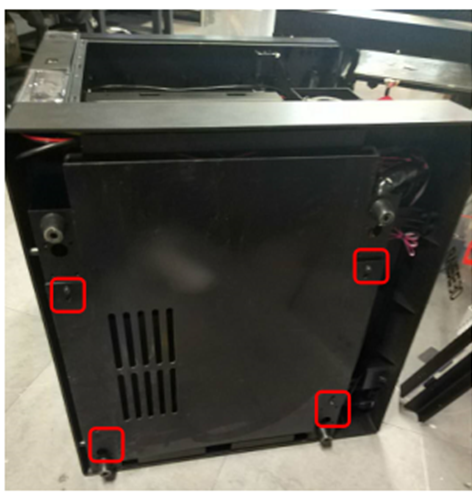 1. Power off the printer, then gently place it down on the left side (with the filament-side door facing up). Use a 2.5 mm hex wrench to remove the four M4x8 screws on the bottom cover.