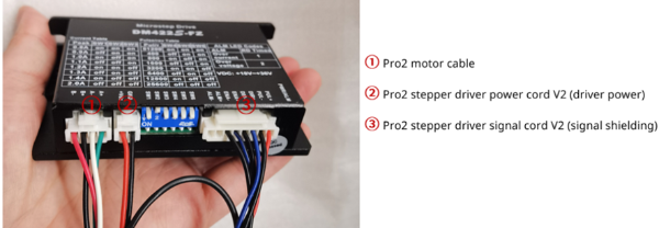 10. Gently insert the Pro2 stepper driver power cord V2 (driver power), Pro2 stepper driver signal cord V2 (signal shielding), and Pro2 motor cable into the new stepper driver as shown in the image.