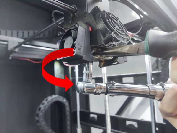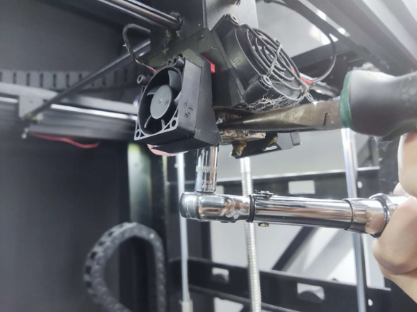 4. Hold the heating block with needle-nose pliers to prevent the heating block from moving. Then cover the left nozzle with an 8mm sleeve. Turn the sleeve clockwise to loosen the nozzle with the sleeve.