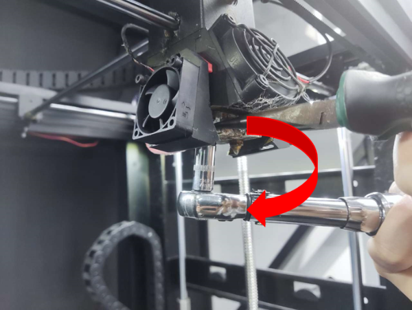 5. Hold the heating block with needle nose pliers to prevent the heating block from moving. Using a torque wrench (8mm socket), set it to 39±1kgf/cm (about 3.9N.m). Turn the torque wrench counterclockwise evenly at until the nozzle is tightened.