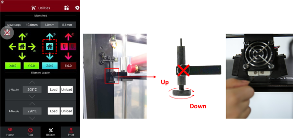 3) In the "Utilities" interface, Click the left nozzle icon , and click the down arrow to check whether the left nozzle can move normally.