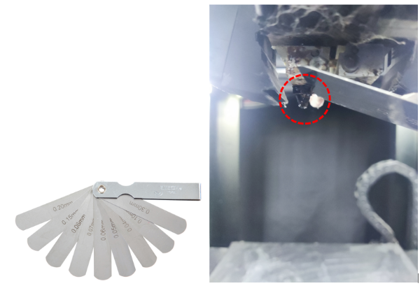 3) When the hot end has cooled down completely, place a 0.3mm feeler gauge under the right nozzle to check if the height is correct.