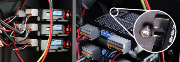 Starting with the stepper driver power and signal cable, plug both cables into their respective slot on the driver. Thread the remaining ends up to the motion controller board compartment and plug the connectors into the board.