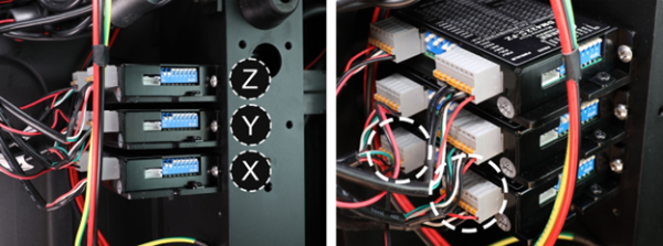 Note: The instructions below will be specifically for the X axis driver and cables, however the process for the other two axis is similar.