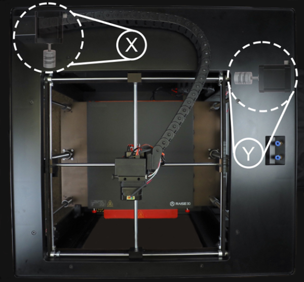 Now that the acrylic panel is removed you should have access to the motor underneath the top skirt of the machine. The X-axis stepper motor is located at the back left corner of the machine.