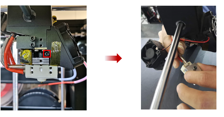 6. Loosen the clamping screw, marked in red, using a 2.5mm hex wrench. Remove the hotend from the shifting assembly. Carefully extract the heating rod and thermocouple from the hotend.