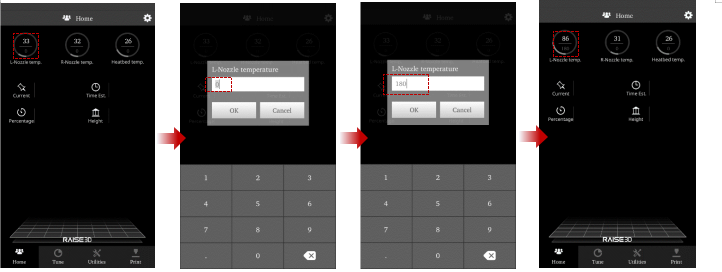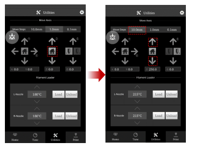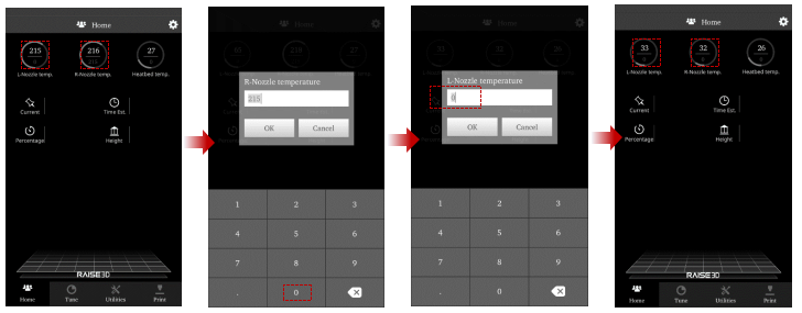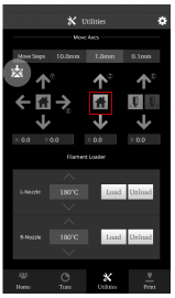 3. Open the ‘Home’ tab, and click on the nozzle temperature. In the new window, set the temperatures for both nozzles to 0, and press OK. Allow the components to cool down completely before continuing.
