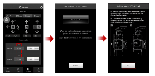 2. Set both extruders to the proper unloading temperature. The recommend target temperature is typically 5-10C higher than its common printing temperature. Press ‘Unload’ to begin the unloading process. After the unloading process has completed, remove the filament and filament guide tube from the extruder.