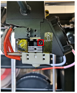 14. Once the hotend has cooled completely, Insert the feeler gauge under the right nozzle and check for proper height. If the nozzle needs further adjustments, loosen the setting screw, and manually move the hotend until it is able to come in contact with the feeler gauge.