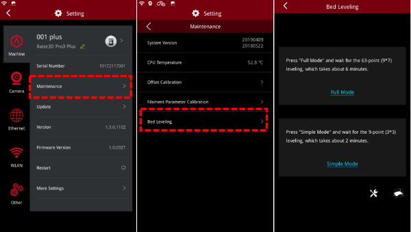 7. Click “Maintenance”, then select “Bed Leveling”. You will enter the bed leveling interface.