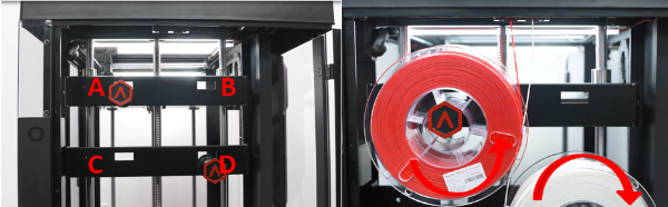 Note: If the spool is installed at points B and D, keep the filament spool rotating clockwise. However, if it is installed at points A and C, keep the filament spool rotating counterclockwise.
