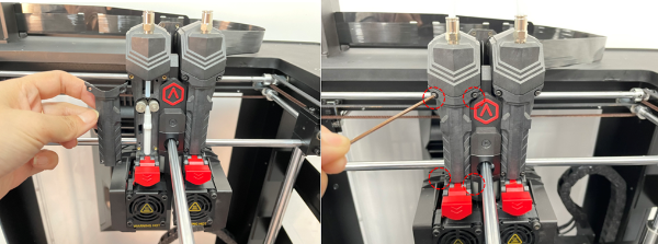 1. Turn off the power of the printer, use a 1.5mm hex wrench to remove the 4 screws on the front cover of the extruder, and then remove the front cover.
