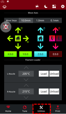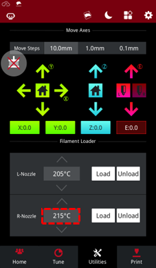 2. Set the temperature of the nozzle to the proper loading temperature. For example, the Raise3D PLA default loading temperature is 215℃. In this guide, we demonstrate how to perform this procedure using the right nozzle as an example. We set the right nozzle temperature to 215℃.