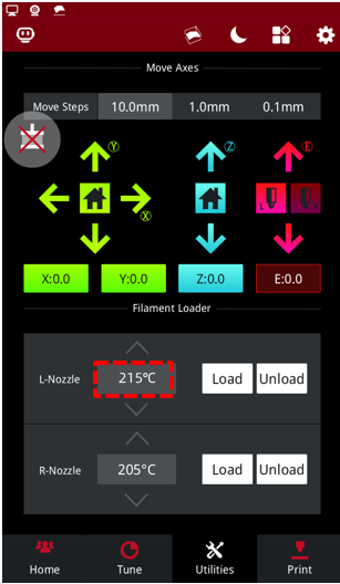 2)Set the temperature of the nozzle to the proper unloading temperature. For example, the Raise3D PLA default loading temperature is 215℃. Here, we use the left nozzle as an example of how to perform this procedure. We set the left nozzle temperature to 215℃.