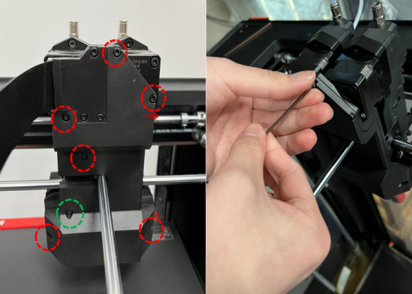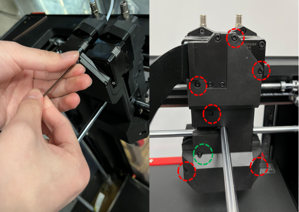 8. Install the back cover and install the 7 screws. 6 of the screws require a 2 mm hex wrench to remove them and are indicated with a red circle in the image below. One of the screws requires a 2.5mm hex wrench to remove it and is indicated with the green circle in the image below.