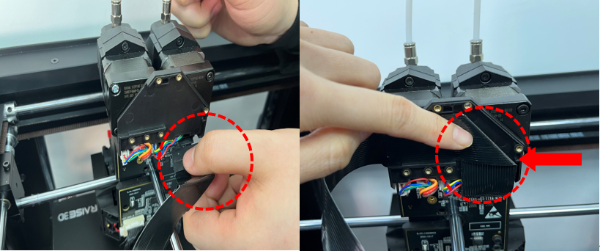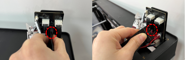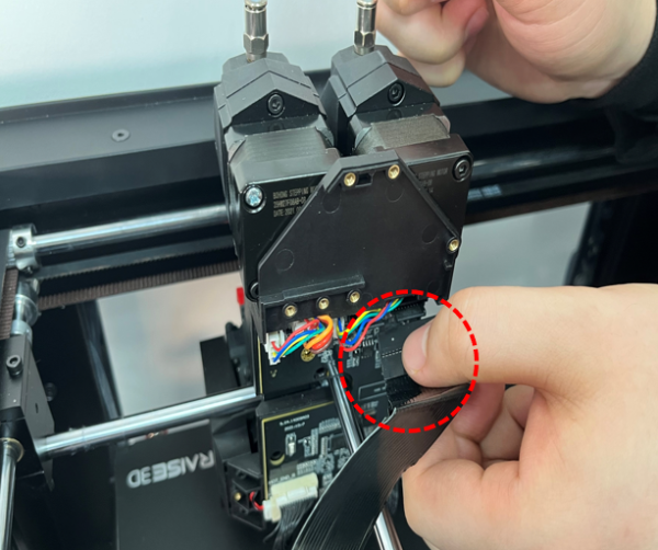 6. Locate and press the buckle on the flat cable connector, insert it into the slot, and fold the flat cable along the shape of the extruder.