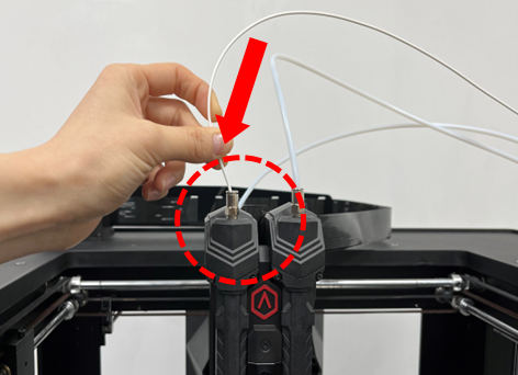 4)The extruder gear will start to rotate. Gently push the filament into the extruder. When the filament extrudes from the nozzle, click "OK" to complete the loading.