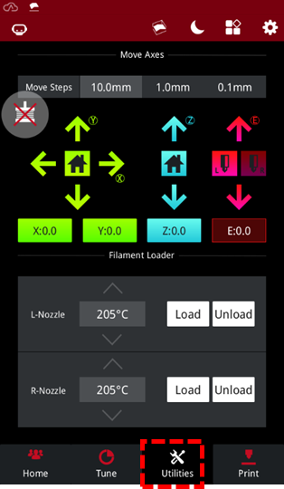 2)Set the temperature of the nozzle to the proper unloading temperature. For example, the Raise3D PLA default loading temperature is 215℃. Here, we use the left nozzle as an example of how to perform this procedure. We set the left nozzle temperature to 215℃.